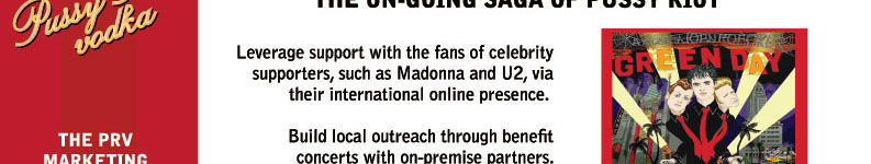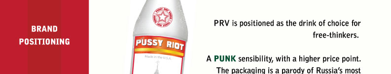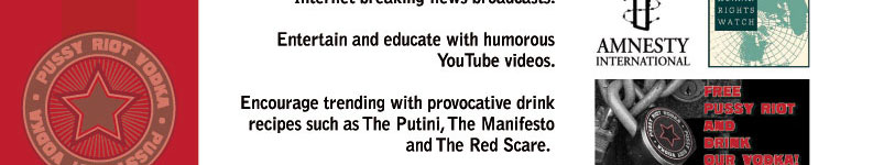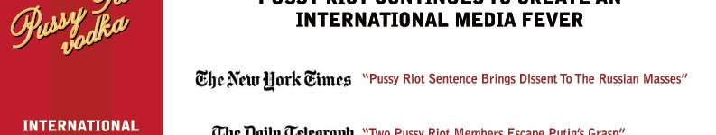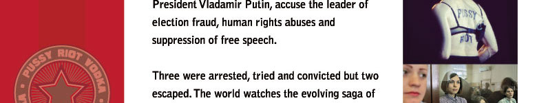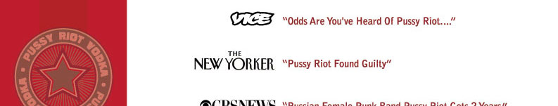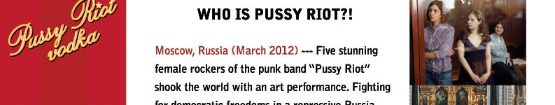 Disclaimer: Parody. Satire. This website is unauthorized and in no way affiliated with the artist-activists known as Pussy Riot. Pussy Riot Vodka and Pussyriotvodka.com is an international interactive art piece by Los Angeles artists Gordy Grundy and Michael Delgado intended as timely commentary on the asymmetrical power of social media, an examination of the different perspectives on what precisely constitutes free speech and a parody of the manner in which worthy causes are often highjacked for selfish motives. |